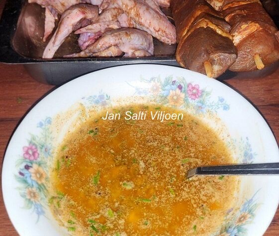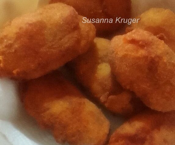 HOENDERKROKETTE Resep en foto: Susanna Kruger 2 hoenderfilette 3 aartappels 1 medium ui 3 eier 1 teelepel bakpoeier knippie sout en peper 1 teelepel origanum en kruie na smaak gerasperde gouda, mozzarella of cheddar na smaak broodkrummels suurlemoensap na smaak olie vir vlak braai Sny die hoender in stukkies, plaas in ‘n voedselverwerker en maak […]