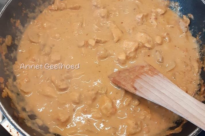 DUVELTJIES VLEES 3 eetlepels ketjap manis 3 eetlepels azijn 1 theelepel sambal ½ zakje nasikruiden 3 eetlepels tomatenketchup 250 g kipfilet in reepjes 1 eetlepel boter 1 ui ½ doosje champignons 1 eetlepel pindakaas 1/8 liter slagroom dus een bekertje of zo’n pakje van de aldi Wel de nasikruiden in heet water Maak de marinade […]