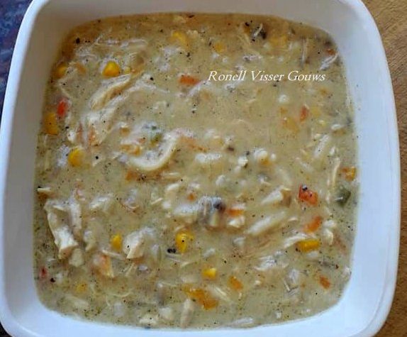HOENDERNOEDELSOP Resep en foto: Ronell Visser Gouws 1 groot ui, fyn gekerf ½ soetrissie (greenpeper), fyn gekerf ½ pak vars sampioene, gesny 1 eetlepel knoffel 2 tot 3 groot hoender borsies 2 blokkies hoenderaftreksel 1 blik heel pitmielies 1 handvol spaghetti, in klein stukkies gebreek 1 aartappel, gerasper 1 wortel, gerasper 1.5 liter water 400 […]