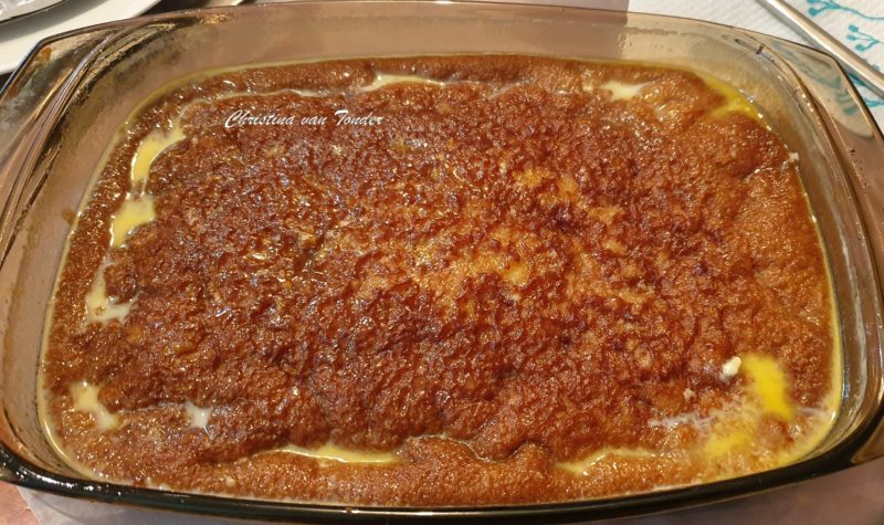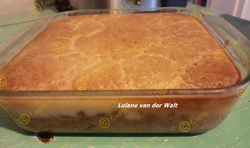 GROENVLEI JAN ELLIS POEDING Ek het die Food Lovers resep bietjie aangepas en die sous met kondensmelk gemaak. 10/10 sê my pa. 1 koppie suiker 1 teelepel asyn 1 koppie koekmeel 1 eier 1 koppie melk 1 eetlepel appelkooskonfyt 1 teelepel koeksoda knippie sout Meng alles baie goed saam, plaas in ‘n gesmeerde tertbak. Bak […]