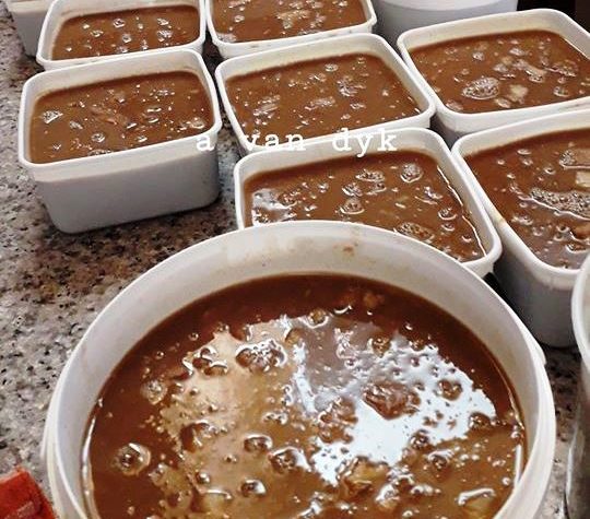 GROOTMAAT BOONTJIESOP “Ek het twee groot 25 liter kastrolle gebruik. Maak ± 30 liter dik bonesop.” Lappiesboontjies kan ook gebruik word. 2 × 2 kg pakke spikkelbone (soek boontjies uit vir slegte bone) water 3 kg varkskenkels 14 mediumgrootte aartappels 12 wortels In twee aparte bakkies, voeg by in elk: 2 lam- en groente soppoeier […]