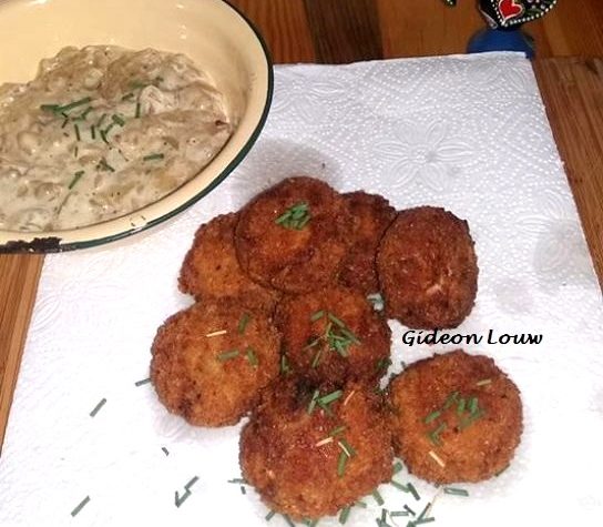 VISKOEKIES VAN GAAR VIS Resep en foto: Gideon Louw ± 300 g gaar vis, wat gevlok is 1 eier 1 eetlepel gewone koekmeel 1 teelepel rissievlokkies 1 eetlepel rissiesous 1 eetlepel soet rissiesous ½ medium grote fyngekapte ui geklitste eier fyn broodkrummels olie vir vlakbraai Meng al die bestanddele saam en maak klein balletjies wat […]