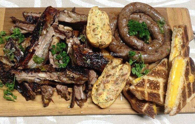 LAMRIBBETJIE EN WORS BORD 1.5 kg lamsrib 1 ui, opesny 100 ml Olof Bergh brandewyn 30 ml olyf olie sap van 2 suurlemoene 30 ml Worcestersous 15 ml geparste knoffel sout en gemaalde swartpeper 2.5 ml Tobasco 10 ml gebreekte koljander 10 ml mosterdkorrels 15 ml Six Gun grill speserye 250 ml Jimmy’s shisanyama sous […]