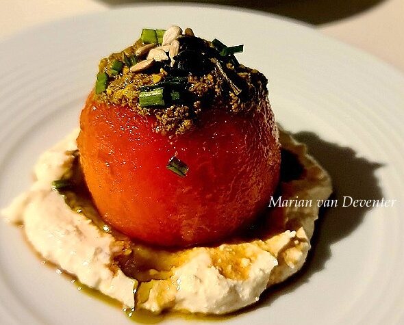 “VERHOOGTE” TAMATIESLAAI Hoeveelhede na gelang van aantal porsies groot heel ferm tamatie per persoon gewone jogurt roomkaas knoffel komkommer tamaties, olywe, uie, agurtjies of enige slaai bestanddele om saam met die komkommer te sny balsamiese asyn olyfolie gemengde sade spriet uie, fyn gekerf basiliekruid pesto (basil) sout en peper Meng die jogurt, roomkaas en swart […]
