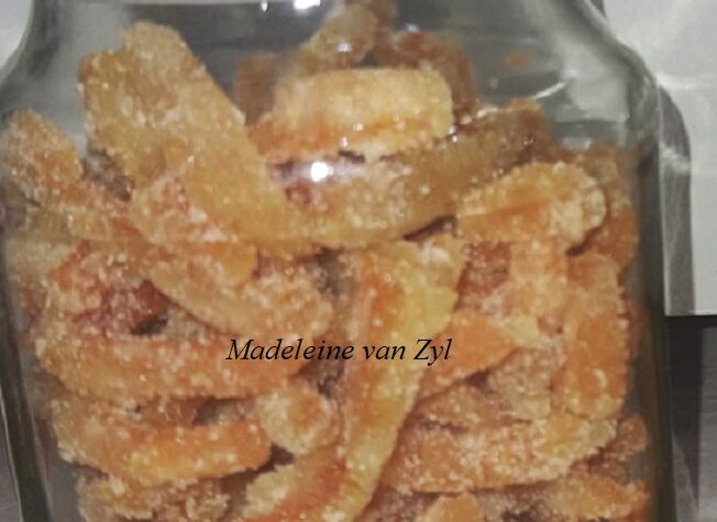 MANDARYN VERSUIKERDESKIL HAPPIE “Het dié Mandarine Candies in ‘n video gesien en vandag gemaak. Dit is vir my baie lekker. Dit word hard soos Candy. Jy kan dit so geniet of saam met patats voorsit.” ±7 mandaryne se skille water, om skille te bedek 1 koppie water, vir stroop 1 koppie suiker, vir stroop suiker, […]