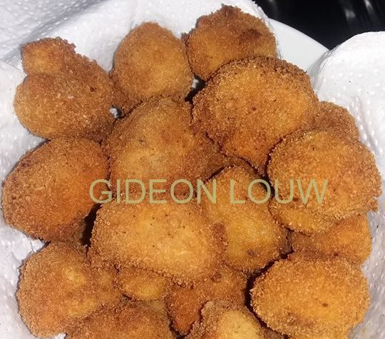 GEKRUMMELDE SAMPIOENE sampioene (mushrooms) Ina Paarman se ‘Seasoned Sea Salt’ koekmeel om in te rol pakkie ongegeurde krummels 1 geklitste eier met ‘n bietjie melk gemeng Kook sampioene 3 minute lank in ‘n effense soutwater. Dreineer. Geur meel met gegeurde sout en rol sampioene daarin. Doop in eier en melkmengsel en rol in krummels. Braai […]