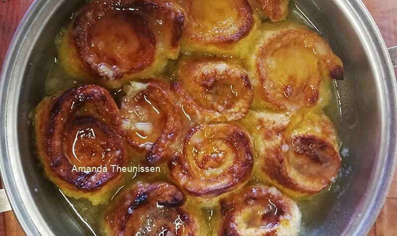 HALOGEEN OOND ROLY POLY POEDING Sous: Kook die volgende saam en plaas in ‘n oondbak: 1 koppie water ½ koppie suiker 1 eetlepel botter Deeg Meng die volgende: 1 koppie meel 1 teelepel bakpoeier Vryf die volgende daarin: ¼ koppie botter Voeg by: 1 geklitste eier Meng tot stywe deeg. Voeg bietjie melk by indien […]
