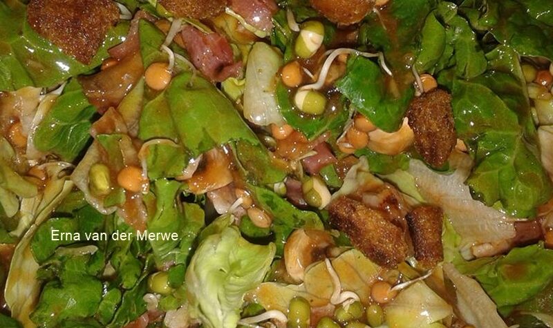 ERNA SE SPINASIESLAAI Meng in slaaibak: blaarslaai 1 bossie jong spinasieblare 1 pakkie spek (bros gebraai en in stukkies) boontjiespruite Pak in houertjies: 8 snye brood se croutons (blokkies in olie gebraai) Meng in ander houer: Slaaisous 1 koppie sampioene, in skyfies en rou ½ koppie bruinsuiker ¼ koppie bruin asyn ⅓ koppie tamatiesous ½ […]