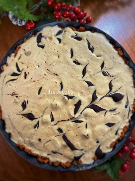 Maak strepe met die sjokolade-roommengsel bo-op die tert en trek ‘n sosatiestokkie deur om patrone te maak.