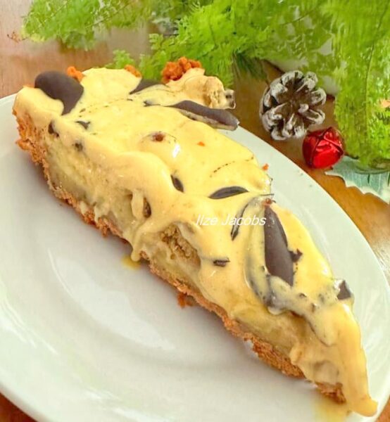 My seuns wou al lankal hê dat ek vir hulle ‘n banoffee tert moet maak, maar met die hitte wil hulle ook ‘n poeding met roomys hê. Toe kombineer ek maar sommer die twee… Banoffee roomystert.