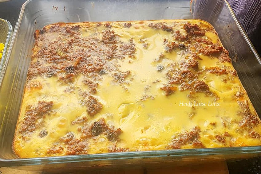Voeg die soppoeier (net so droog) by en die geweekte brood. Klits die eiers, oorblywende 250 ml melk, mosterd en sout na smaak saam. Voeg die helfte van die eiermengselmengsel by die vleismengsel.