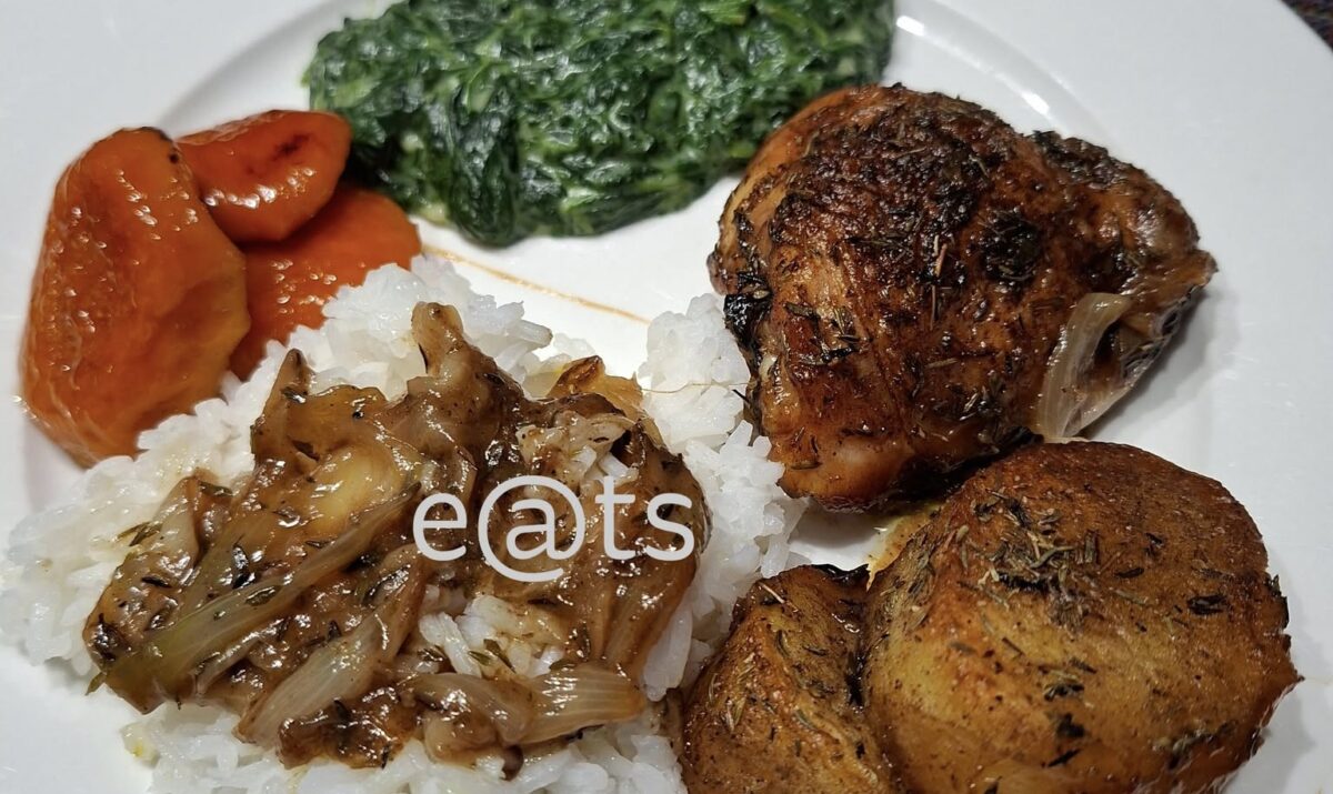 Chicken and fondant potatoes with thyme and onion gravy, creamed spinach and stewed cape peaches. Made a version of fondant potatoes where I fried the chicken pieces in the same casserole dish so that it could bake together in the oven.