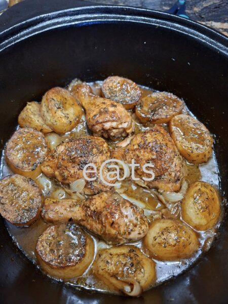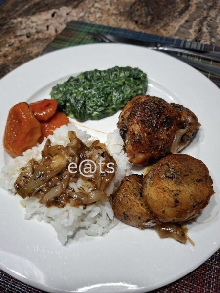 Chicken and fondant potatoes with thyme and onion gravy, creamed spinach and stewed cape peaches. Made a version of fondant potatoes where I fried the chicken pieces in the same casserole dish so that it could bake together in the oven.