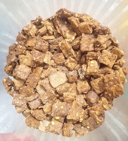 - Druk dit plat in ‘n kleinkoekie pan, bak 180°C tot dit gestol is, sny in blokkies met pizza cutter. Bak nog bietjie en maak blokkies los.