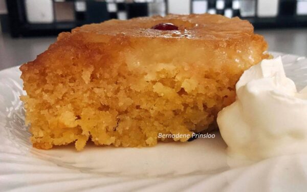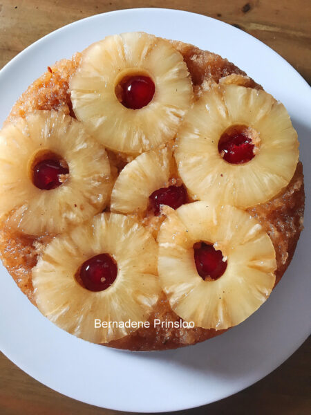 Ek het die koek in ‘n silikoon koekpan gebak, so die pynappels het nie baie donker gebak nie.