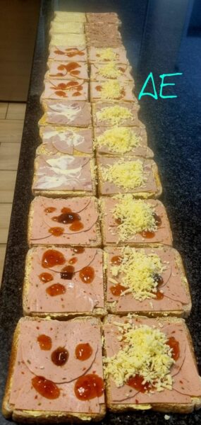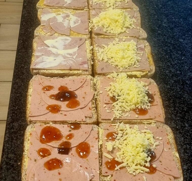 - variety of cold meats, and cheese with a sauce like, bbq, sweat chilli, peri peri, mayonnaise, etc. Cold meat on both sides, the sauce and cheese in the middle to prevent the bread from going soggy.