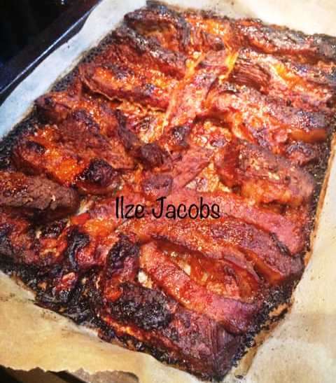 Marineer minstens 2 – 3 ure. Haal vleisrepe uit die sous en pak op ‘n bakplaat, uitgevoer met bakpapier.