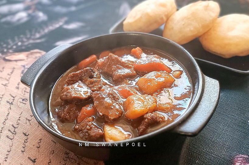 • Verhit die olie in ‘n dikboom pot. Plaas ‘n deel van die vleis daarin en braai tot mooi bruin aan albei kante. Verwyder en plaas eenkant. Herhaal tot al die vleis gedoen is.