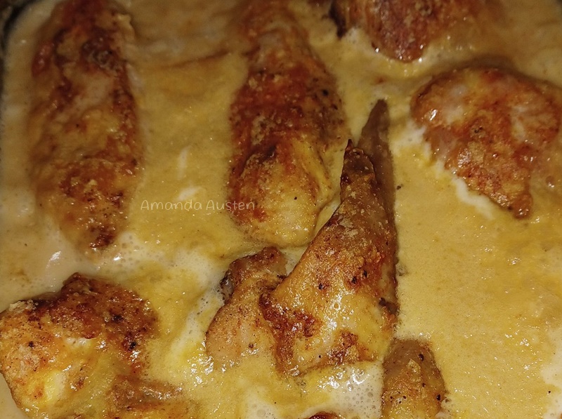 Giet die verpulpte sous oor die hoender en bak onbedek verder vir 20 – 25 min tot die sous verdik het.