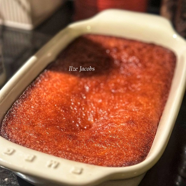 - Kook die stroop bestanddele terwyl die poeding bak, en giet die sous oor die warm poeding sodra dit uit die oond uit kom.