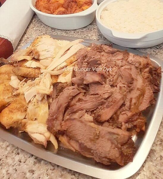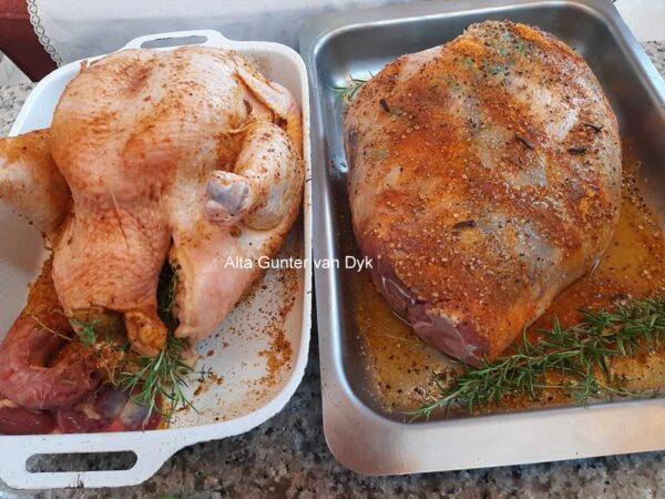 Ongeveer 3 kilogram lamsboud en 1 groot hoender, amper 3 kilogram, dit is ‘n skrophoender (organies), kom van die plaas af.
