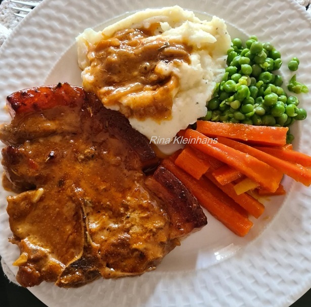 Haal die deksel af, draai die oond op 200ºC en laat die vark tjops bak tot die sous lekker verdik het en die tjops sag is. Nie nodig om die tjops om te draai nie, ek het net elke nou en dan die pan so bietjie skuins gedraai al die kante toe dat die sous wat onder die tjops is, ook boontoe kom om te verdik.