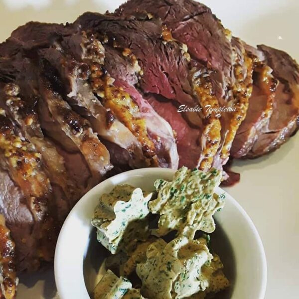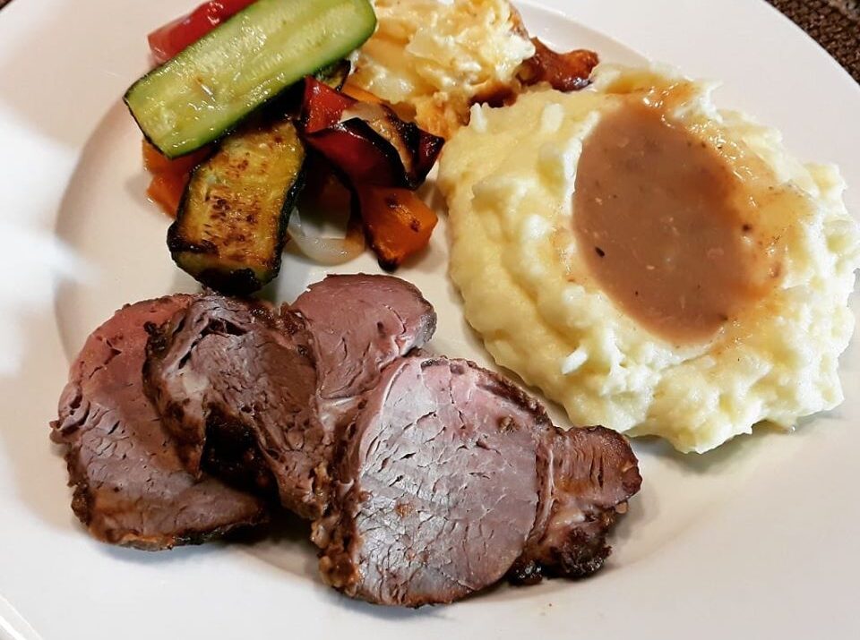 ‘n Prima riboog met fyn aartappels en oondgeroosterde groente. Ek het die stuk vleis oor twee dae in die yskas ontdooi en natuurlik gaan dit teen kamer temperatuur in die oond. Dit was oorgenoeg gewees vir 10 mense plus ekstra om dun te sny vir koue vleis vir môre.