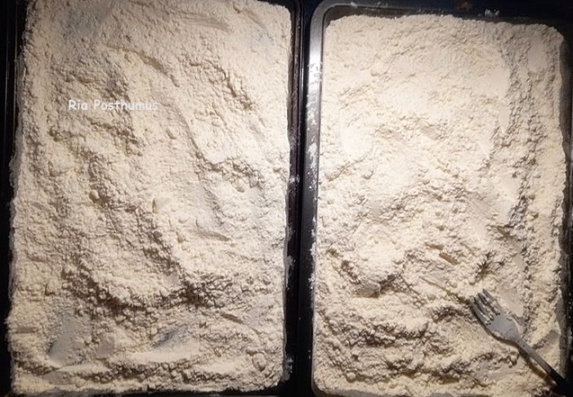 Strooi meel in bakplate, plaas op rakke nie te na aan element nie.