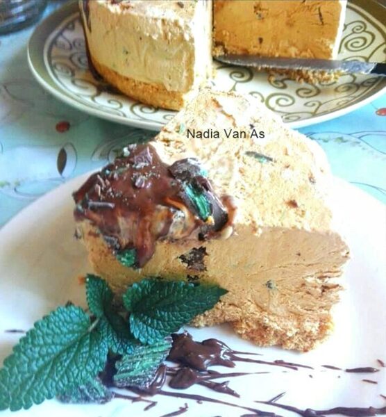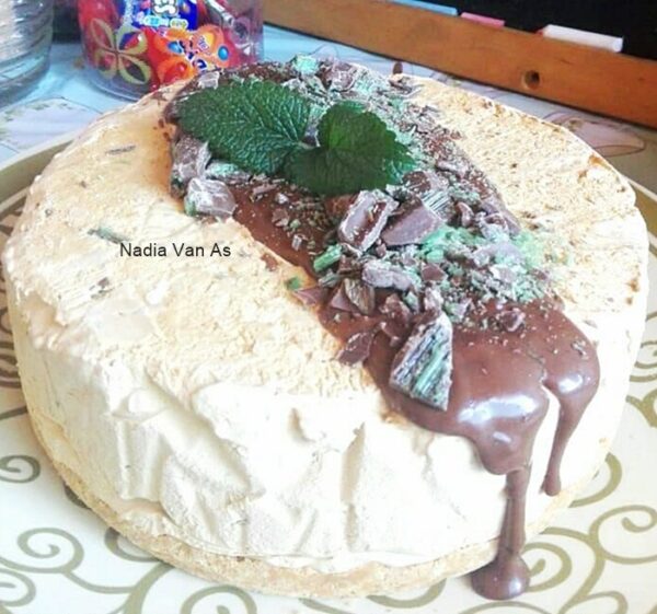 Fold the peppermint crispy splinter in with a spoon and pour over biscuit base, cover with foil and freeze overnight.