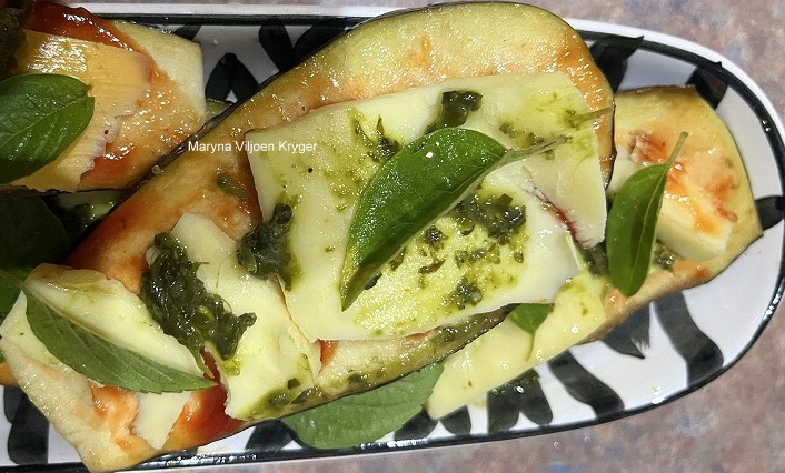 • Smeer die tamatiepasta as basis op elke eiervrugskyf, plaas dik skywe Mozzarella kaas op die tamatiepasta en bedruip die kaas met pesto (ek het Ina Paarman se pesto gebruik).