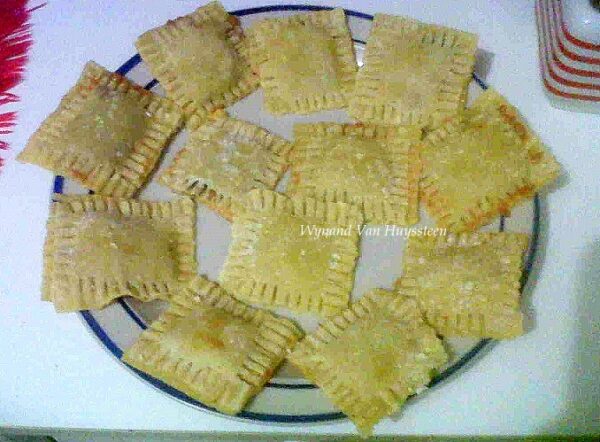 - Gebruik ’n skerp mes en sny pastaporsies in netjiese sirkels, of gebruik ‘n koekiedrukker (10 cm) met ‘n kartelrand sodat dit lyk soos op die foto.
