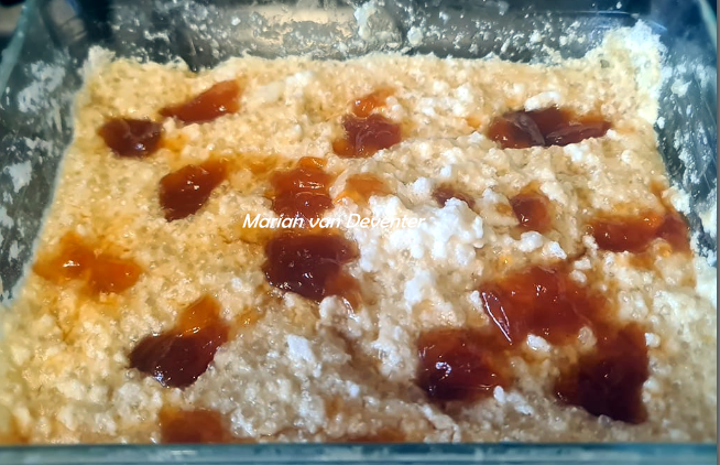 Skep die mengsel in ‘n glas bak van jou keuse en blop so hier en daar appelkooskonfyt bo-oor en strooi bietjie kaneel oor.