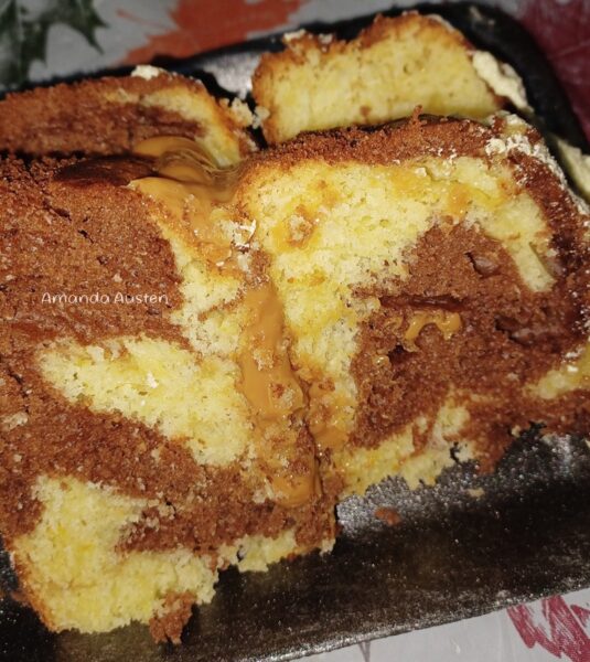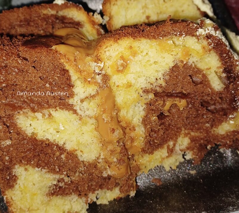 Skep lepelsvol van elke beslag afwisselend in die twee koekpanne en trek met ‘n mes daardeur om ‘n marmer effek te kry. Bak 45 – 50 min lank tot toetspen skoon uitkom. Laat afkoel en keer uit.