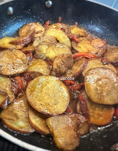 Voeg 75 ml kookwater by en smoor nog 10 – 15 minute totdat die patats sag is en meeste van die vloeistof weggekook het.