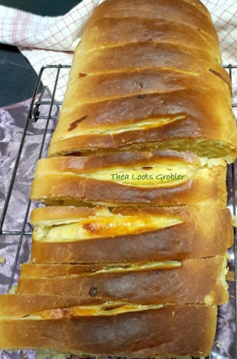 Knie omtrent 10 min tot elasties. Rol in ‘n bal en smeer olie oor, plaas op warm plek en laat rys tot verdubbeld. Knie af en rol uit omtrent halwe cm dik. Smeer vulsel oor, kan kaas oor rasper.