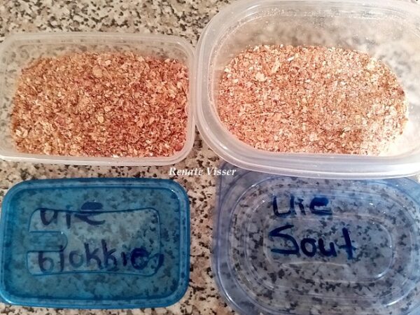 Dan gaan albei (poeier en vlokkies) in 2 verskillende panne vir ‘n derde keer oond toe vir nog so 20 min tot ‘n halfuur.