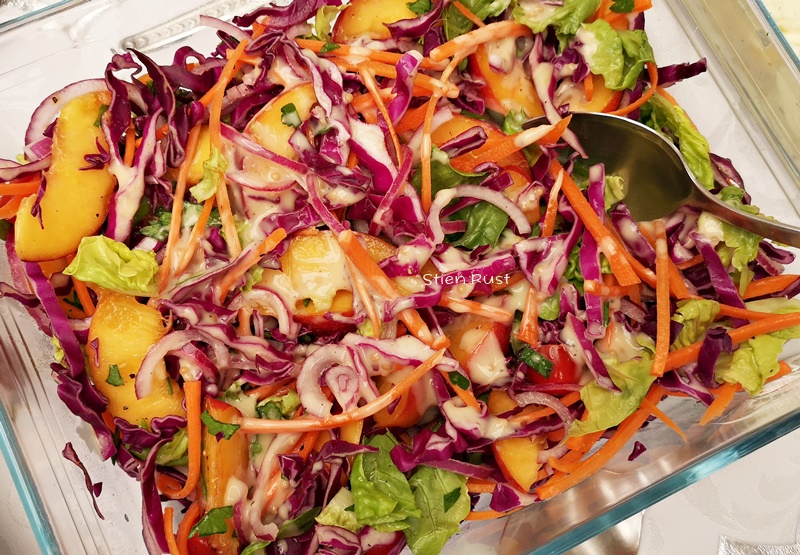 - Ek kom wys net. Ons het gister Christelle se somerslaai gehad. Ek kon nie radyse kry nie en het nie die ham bygevoeg nie. Het wortelrepies bygevoeg met heuning- en mosterdslaaisous, ligweg oorgegiet en die orige slaaisous op die tafel geplaas vir die wat van meer sous hou. My mense was eers nie baie te vinde vir nektariens in ‘n slaai nie, maar hulle het heerlik geëet.