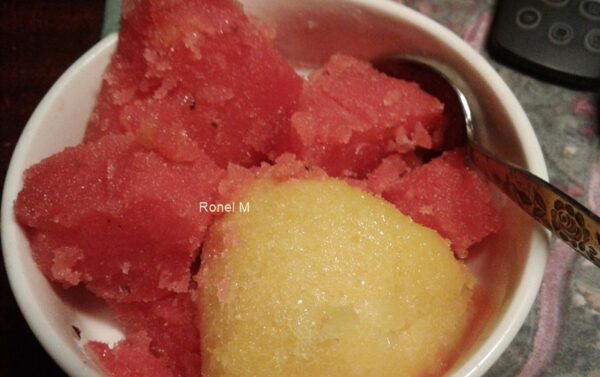 Gooi pulp in 2 liter roomysbak en sit in vrieskas. So na 2 ure het ek dit met ‘n vurk los gekrap.