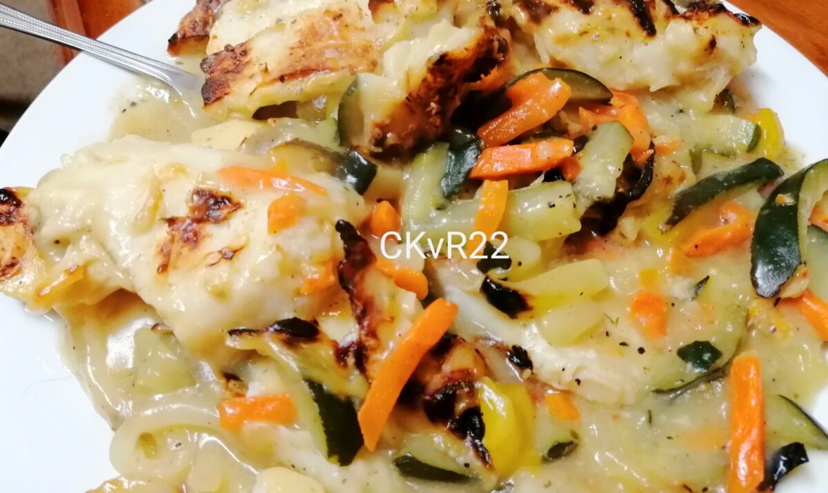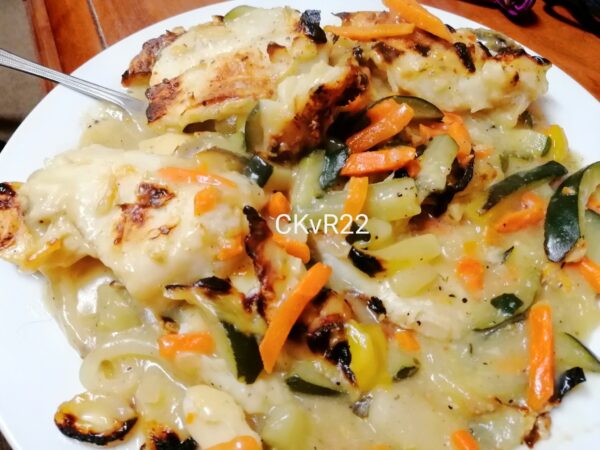Plaas ‘n laag roerbraai groente onder in ‘n gesmeerde glasbak, gevolg deur ‘n bietjie sous, uie en vis, eindig met sous.