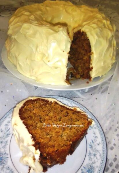 Plaas die mengsel in die ringpan en bak by 180 °C vir ongeveer 45 – 50 minute of totdat ‘n toetspen skoon uitkom.